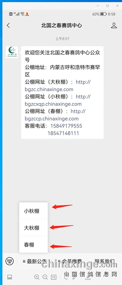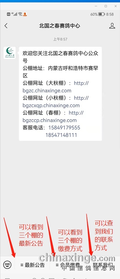 为了方便广大鸽友信息查询,我中心现已经开通微信公众号,公众号目前有三个模块:大秋棚、小秋棚、春棚的最新公告模块;大秋棚、小秋棚、春棚会员缴费模块(不能直接转账,查询所需银行卡账户用);大秋棚、小秋棚、春棚联系方式查找模块。同时公众号也可以直接与我中心发消息沟通您需要了解的信息及问题,后续有新增加功能我中心会及时通过微信公众号通知大家!欢迎大家通过关注微信公众号的方式了解我们!