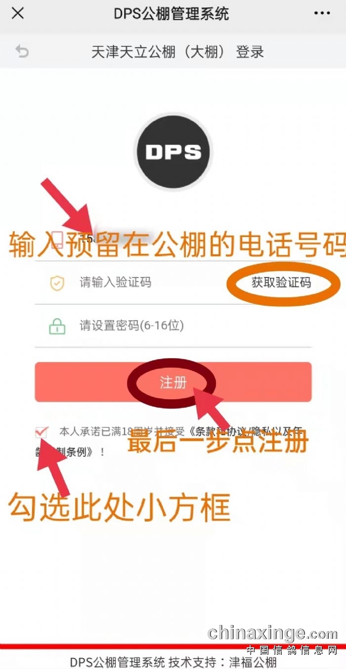 第二步:输入您在公棚预留的手机号,获取验证码并填写验证码,设置密码(以便您以后登录方便)并勾选注册下面的小方框,最后点击注册。